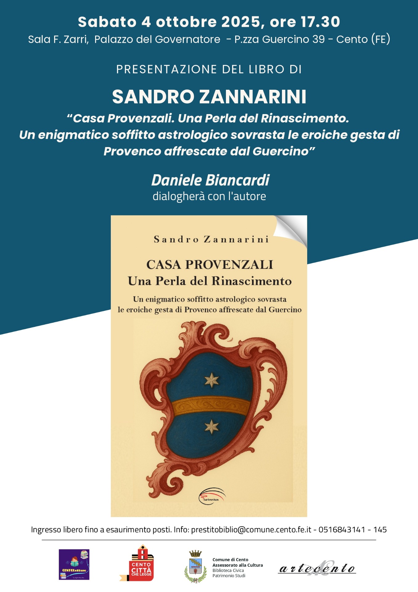 "Sabato 4 ottobre 2025 alle 17.30 presso il Palazzo del Governatore di Cento, sala F. Zarri, verrà presentata la nuova pubblicazione di Sandro Zannarini Casa Provenzali. Una Perla del Rinascimento. Un enigmatico soffitto astrologico sovrasta le eroiche gesta di Provenco affrescate dal Guercino. Nel corso dell'incontro Daniele Biancardi dialogherà con l'autore.L'iniziativa è promossa dall'Archivio storico comunale e dall'Associazione culturale Artecento. Ingresso libero.